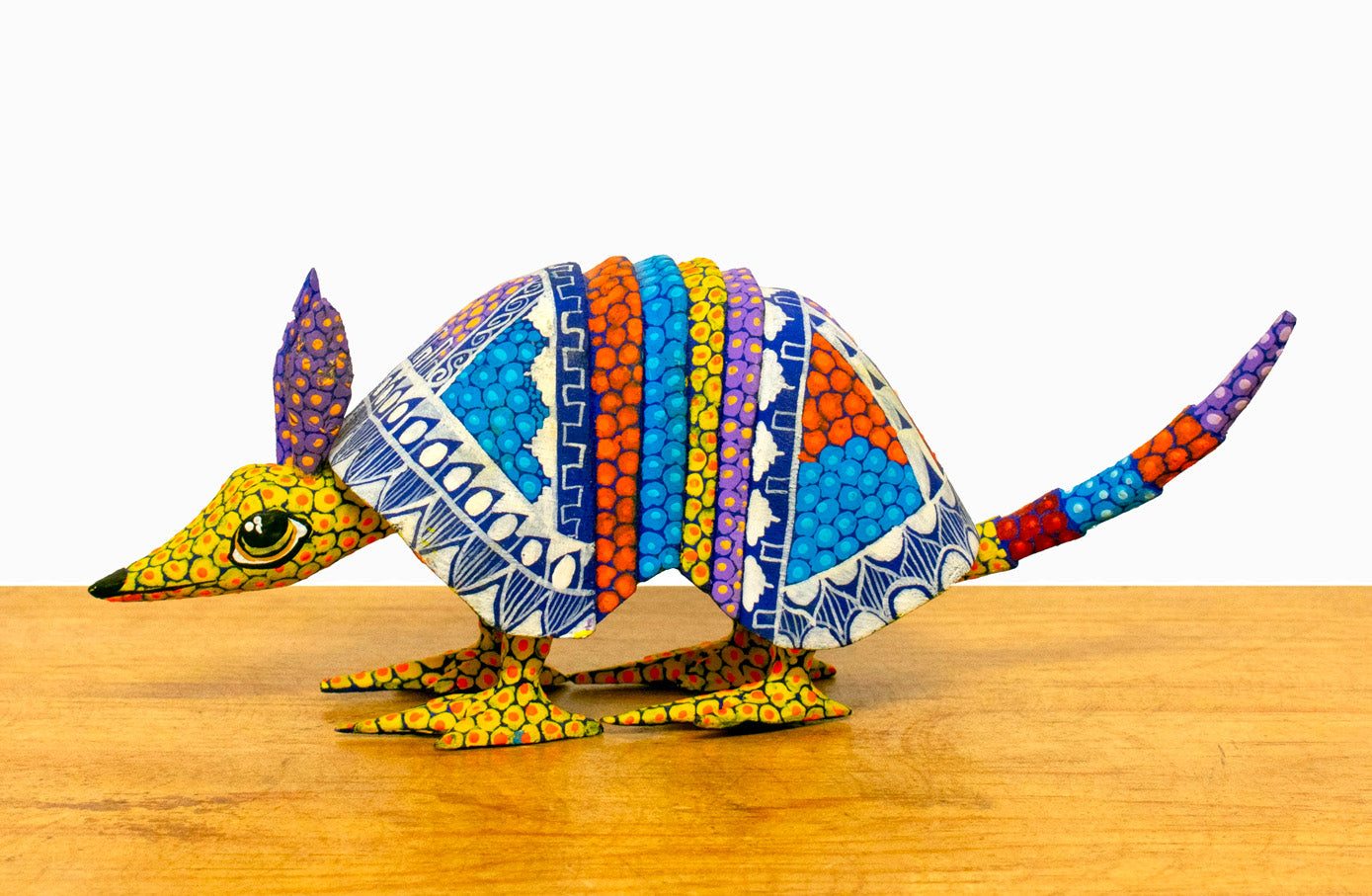 Colorido alebrije con forma de armadillo, pintado y tallado a mano por artesanos mexicanos en el estado de Oaxaca.