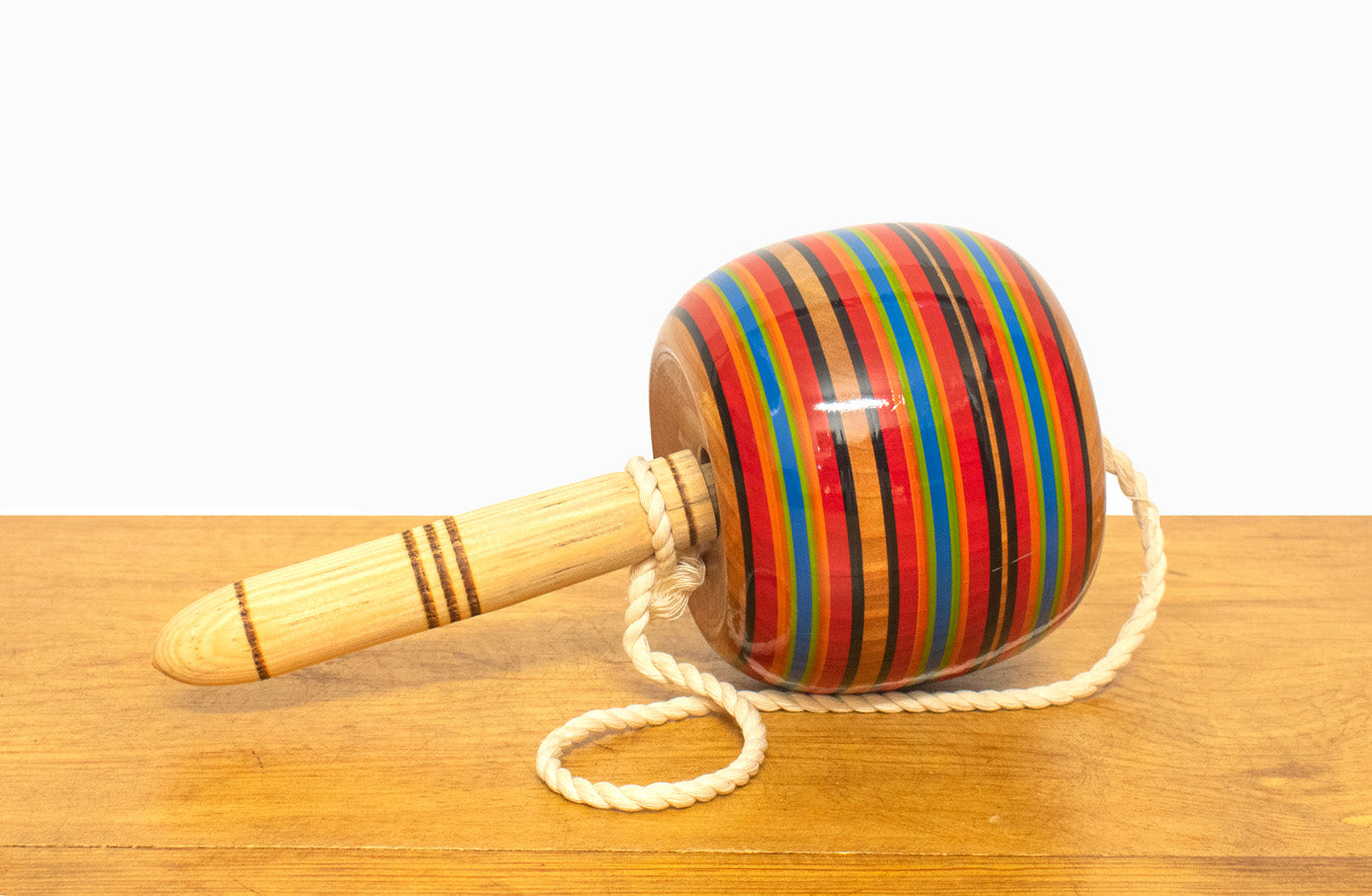 Tradicional balero de madera decorado con lineas de colores, hechos y pintado a mano por artesanos mexicanos en el Estado de México.