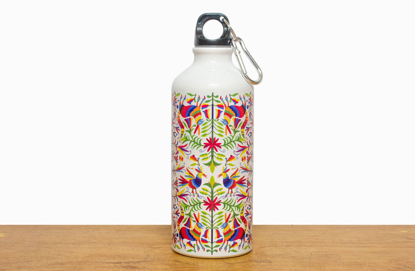 Colorida botella de metal, decorada con motivos tipo Tenango, hecha por artistas mexicanos en la Ciudad de México.