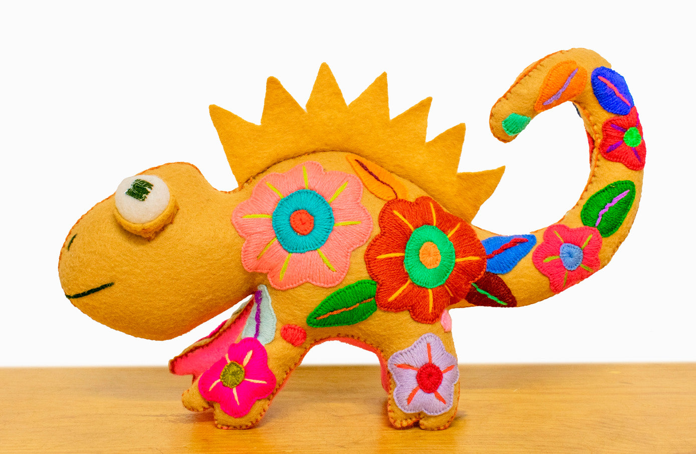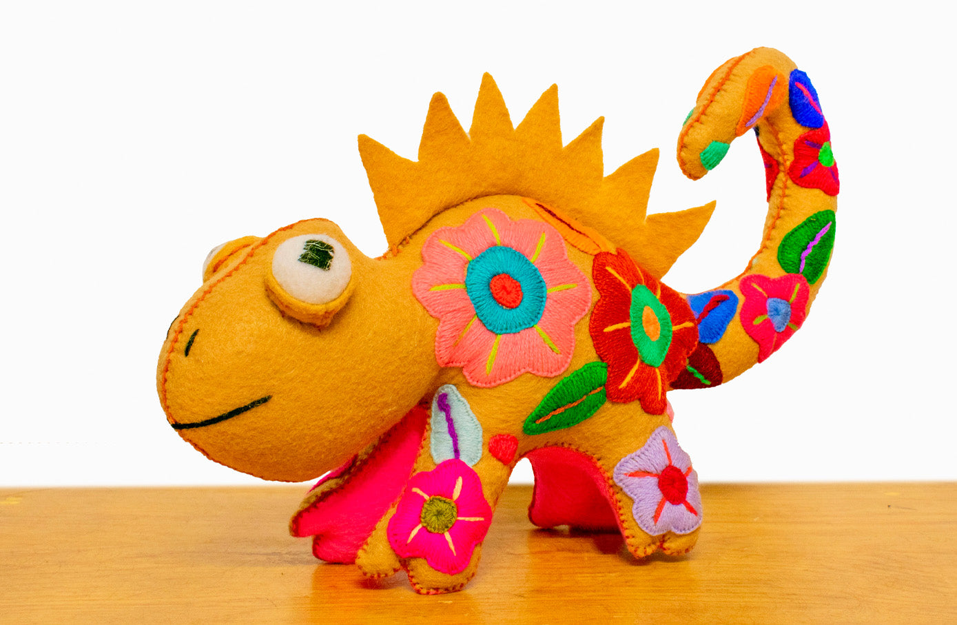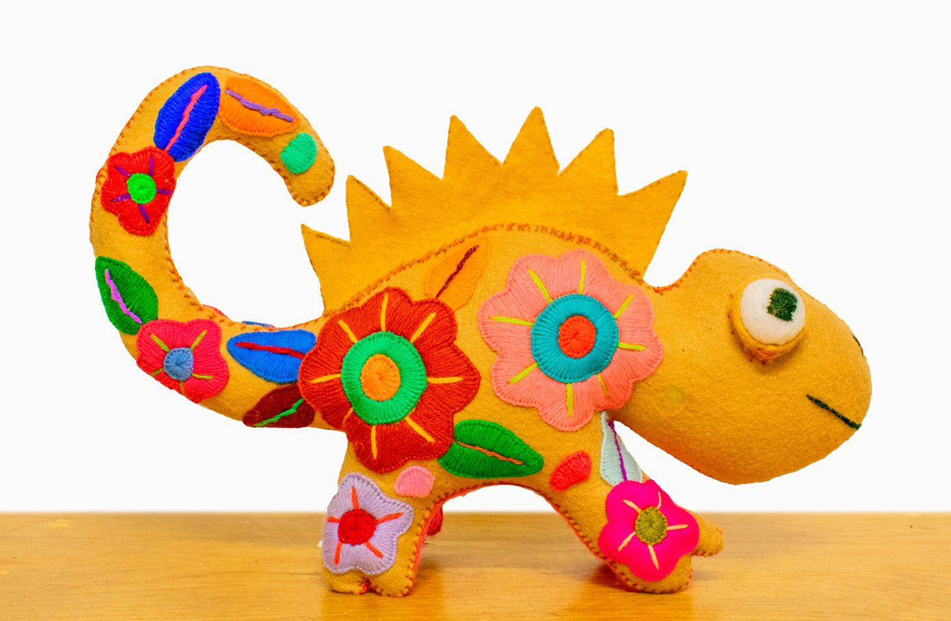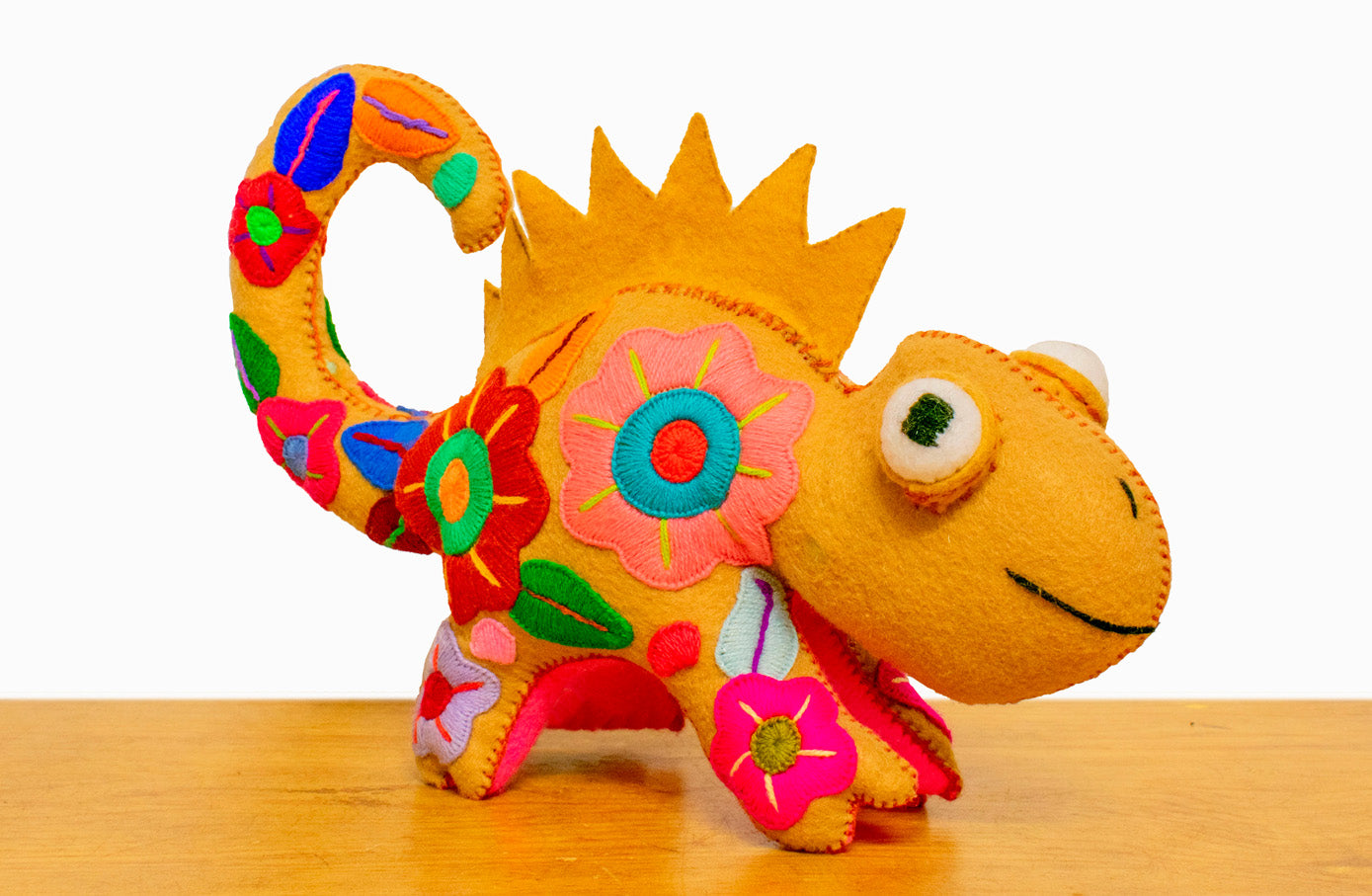 Colorido muñeco bordado con forma de camaleón, hecho a mano por artesanos mexicanos en el estado de Jalisco.