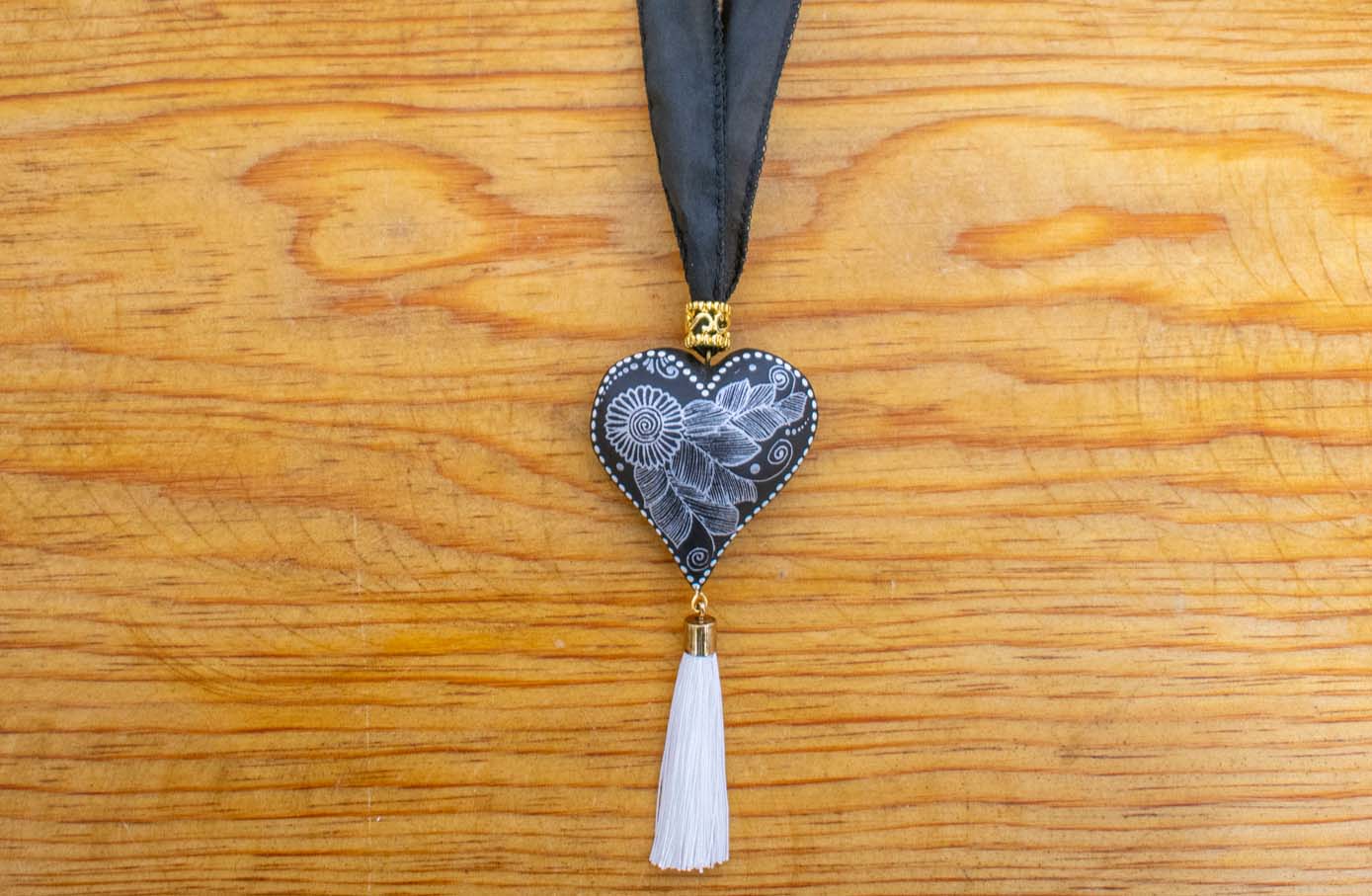 Hermoso collar con corazón de madera decorado, con pompón y tira tipo seda. Hecho a mano por artesanos mexicanos en el estado de Oaxaca.