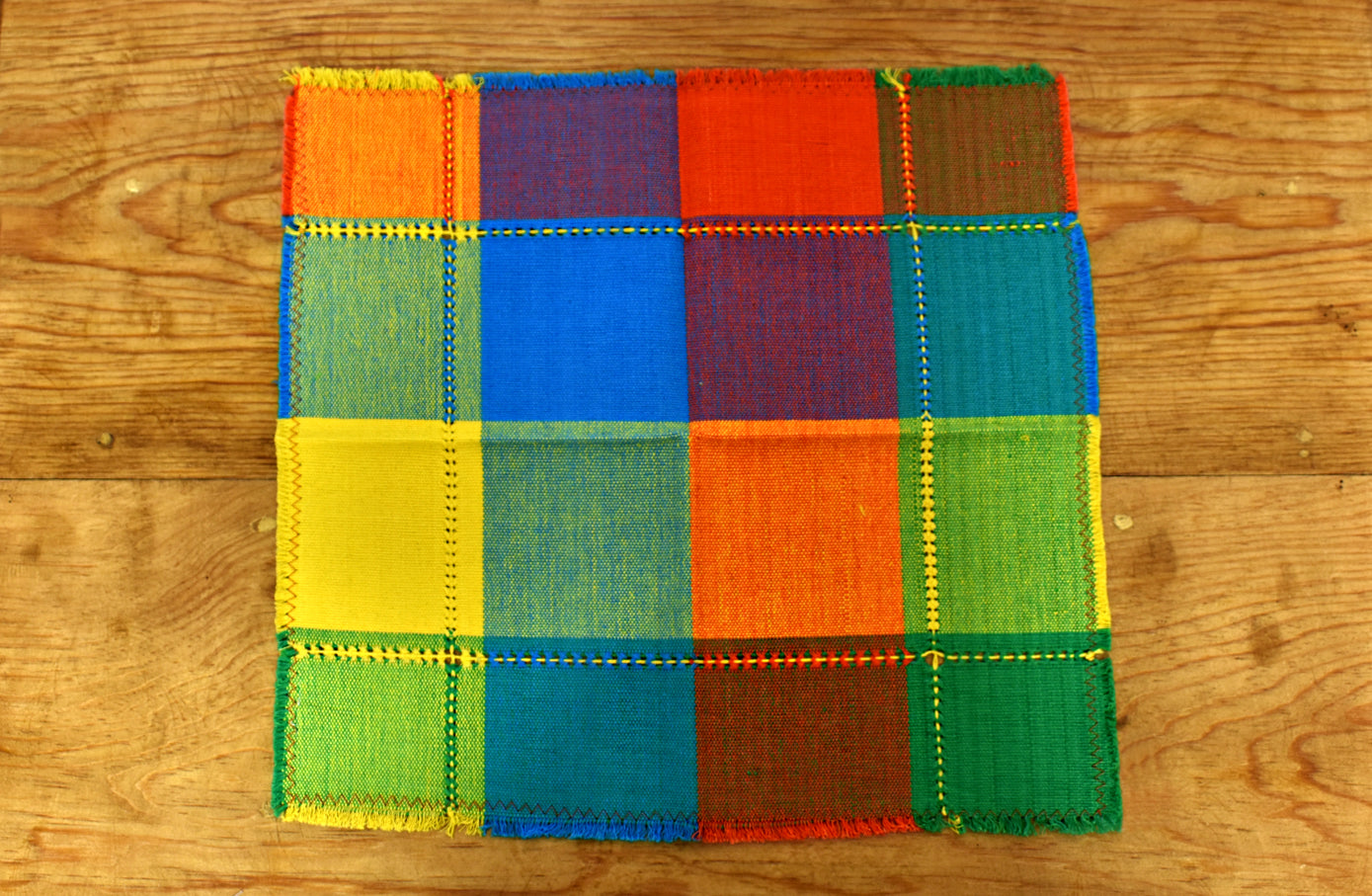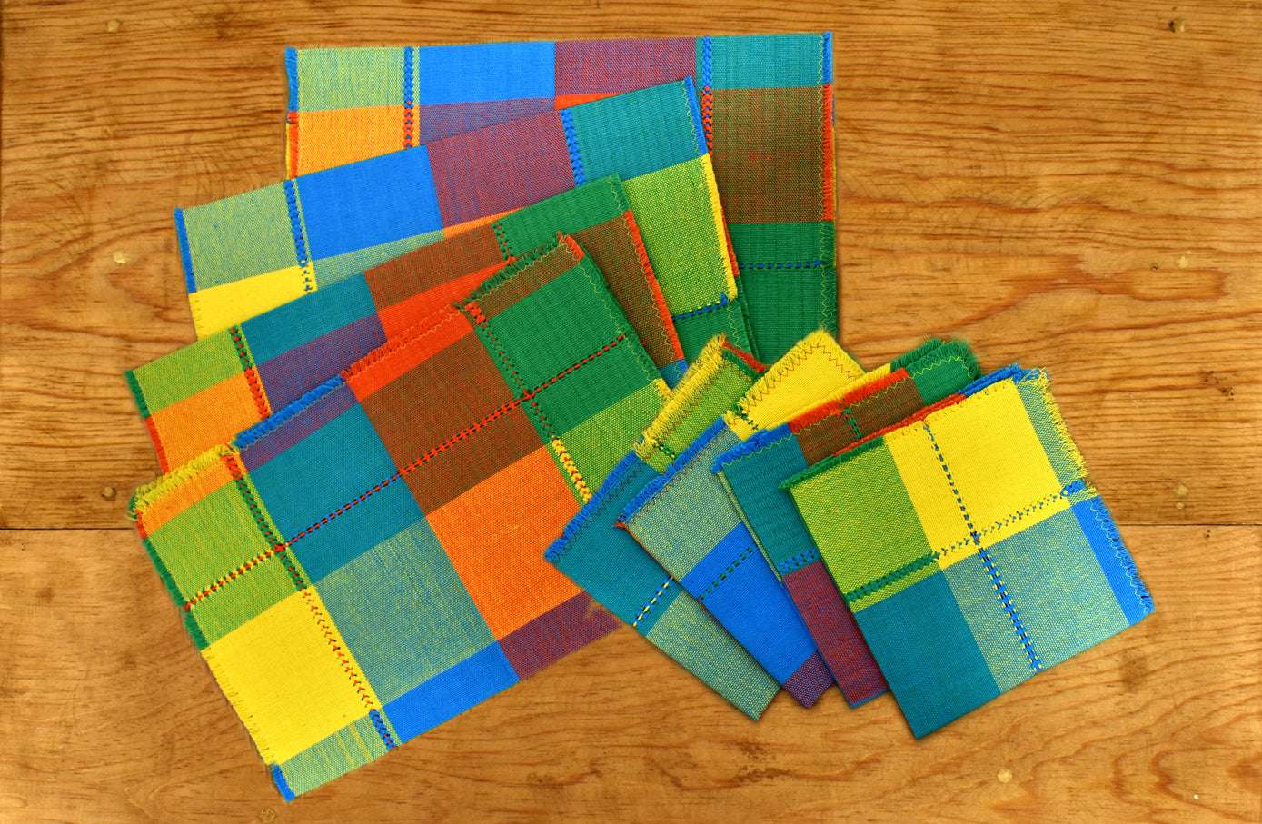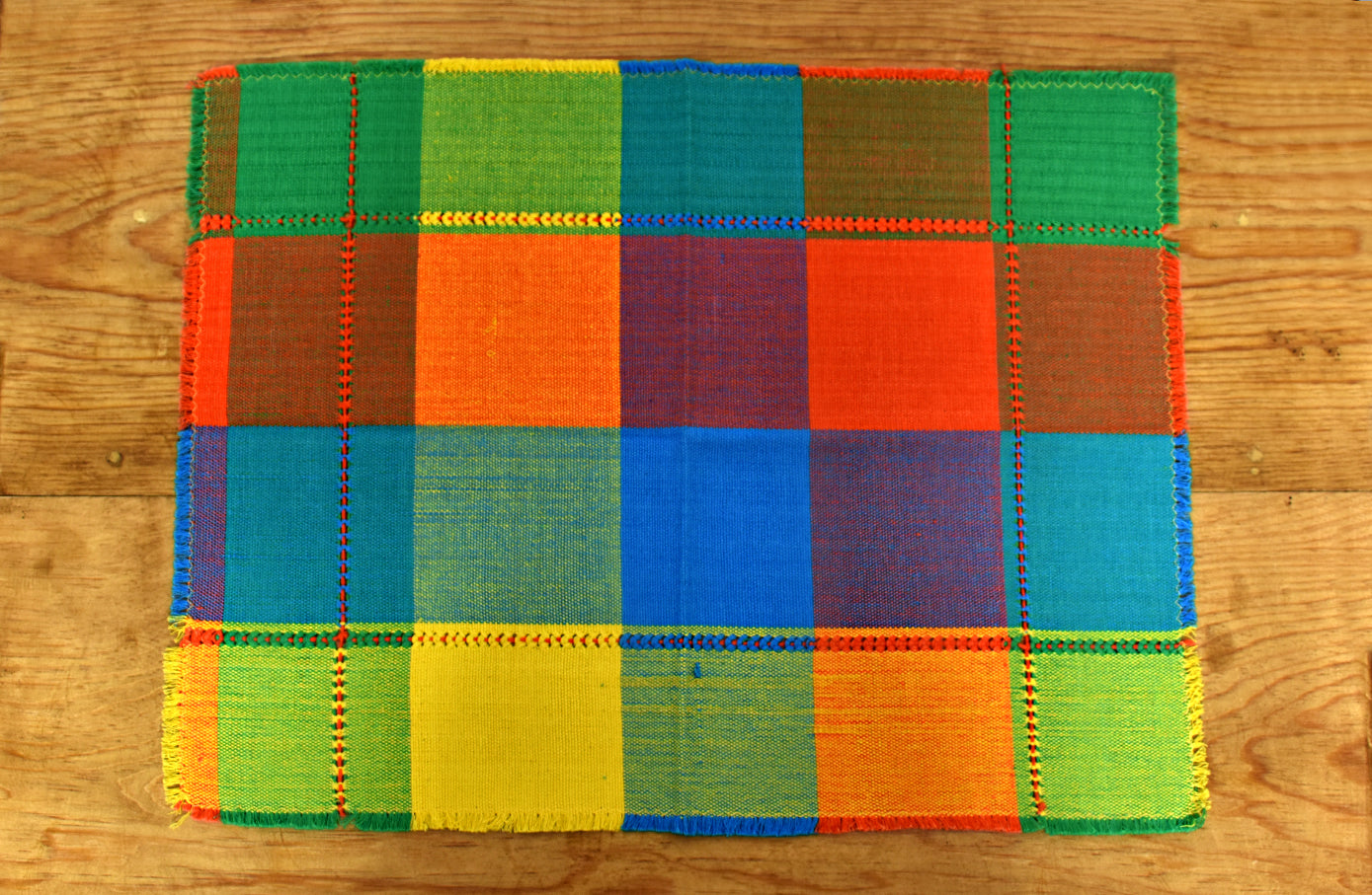 Colorido juego de 4 manteles con sus 4 servilletas, hechas de algodón artesanalmente en el estado de Michoacán.