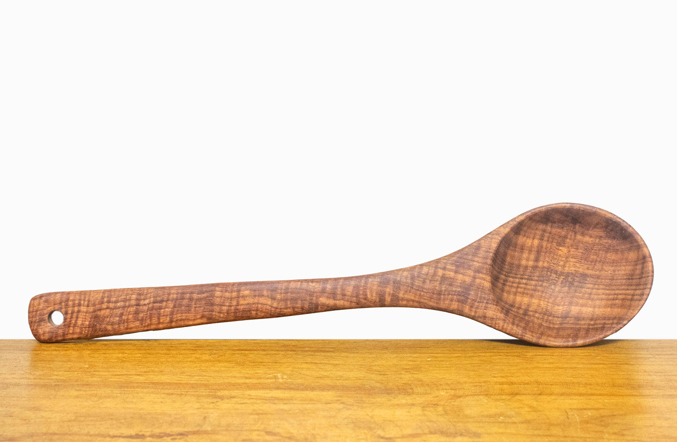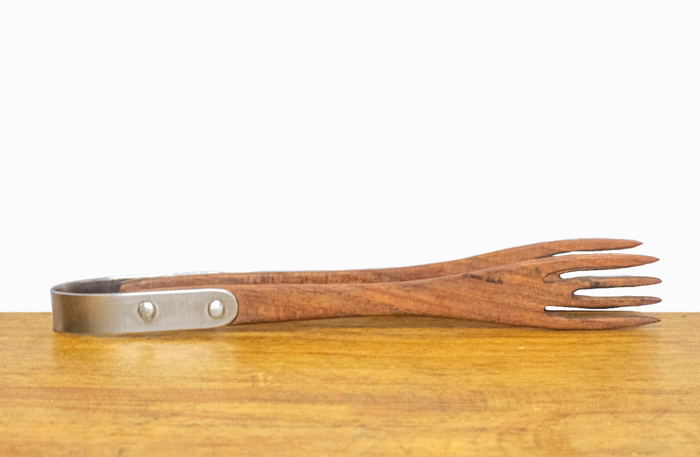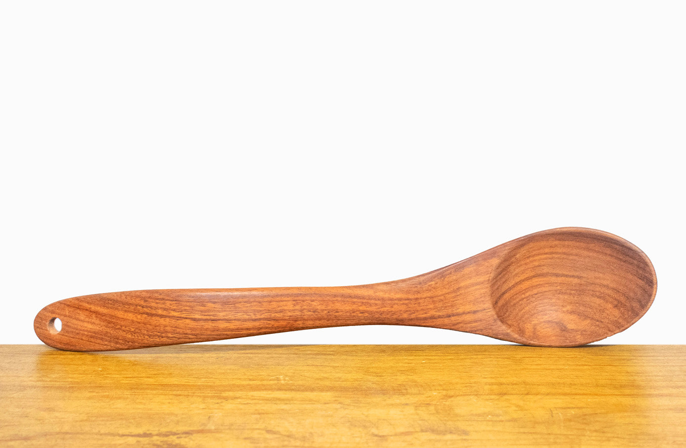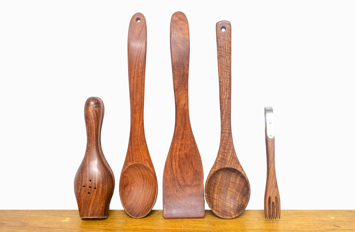 Juego de 5 cubiertos de madera: cuchara recta, cuchara curva, pala, exprimidor y pinzas. Hechos a mano por artesanos mexicanos en el estado de Michoacán.