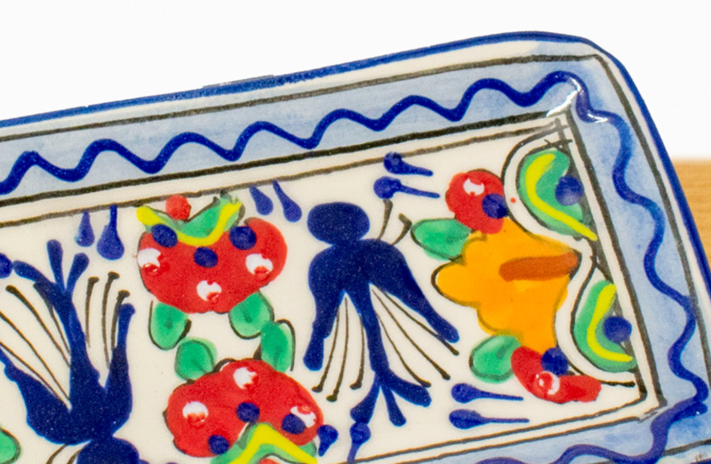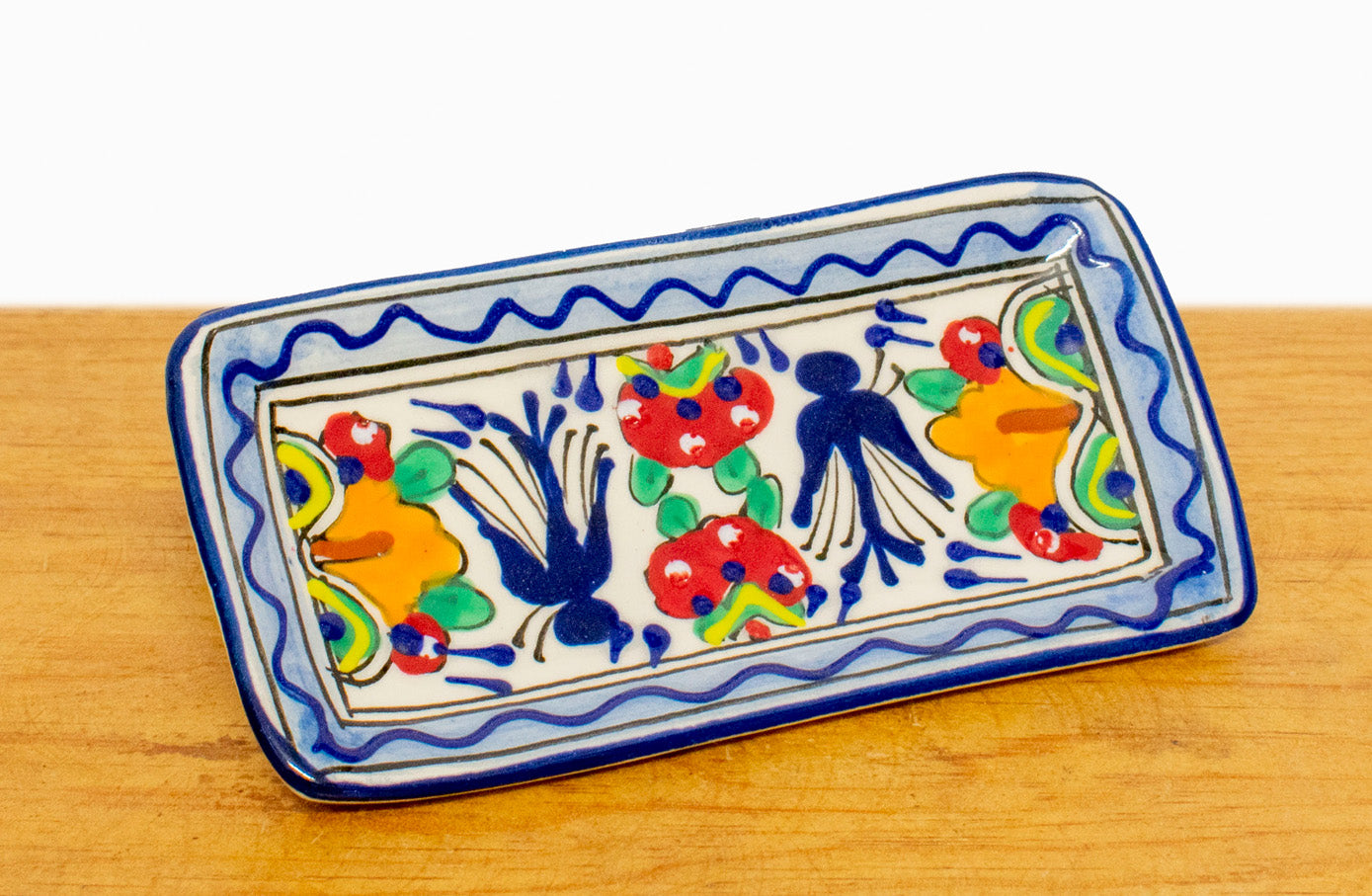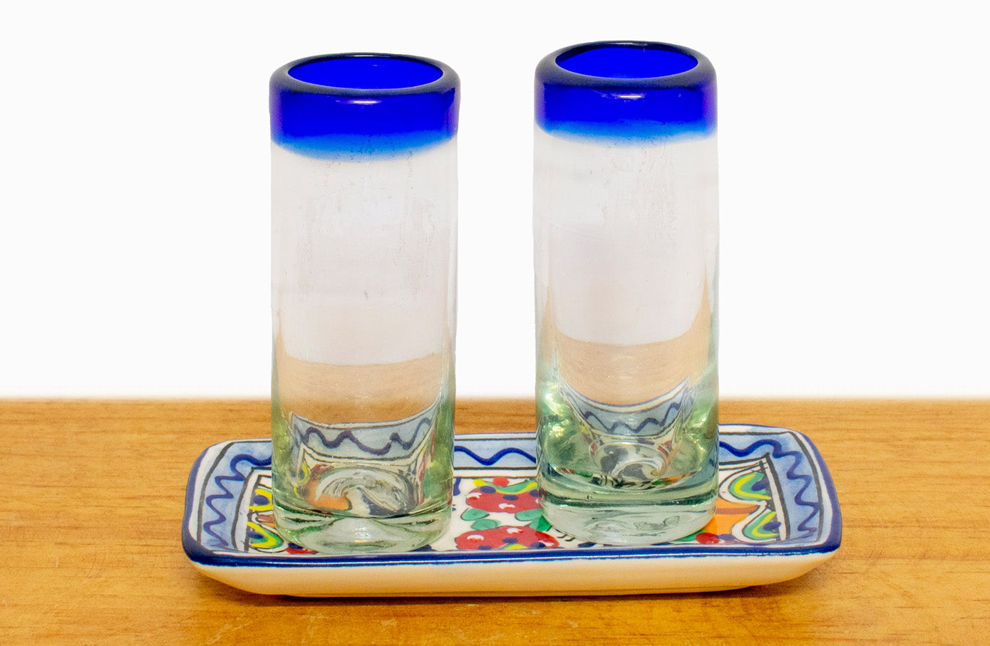 Juego de 2 tequileros de filo azul con charola de cerámica tipo Talavera. Hecho por artesanos mexicanos en el estado de Jalisco.