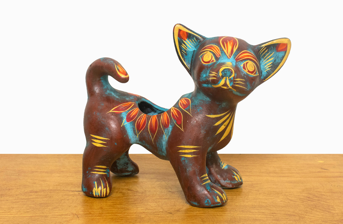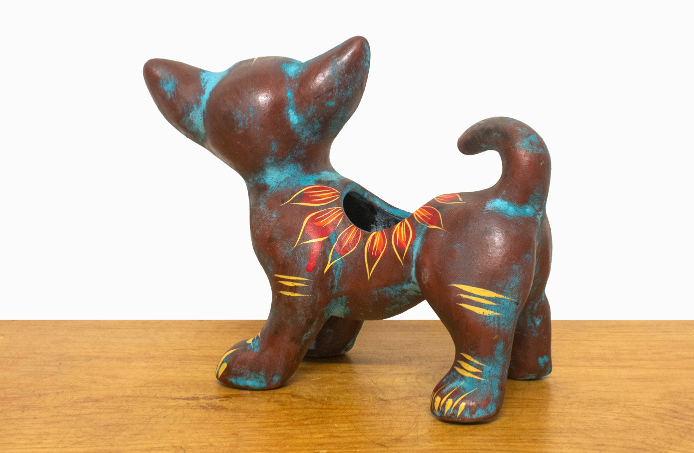 Hermosa maceta con forma de perrito Chihuahua, hecho con barro por artesanos mexicanos en el estado de Jalisco.