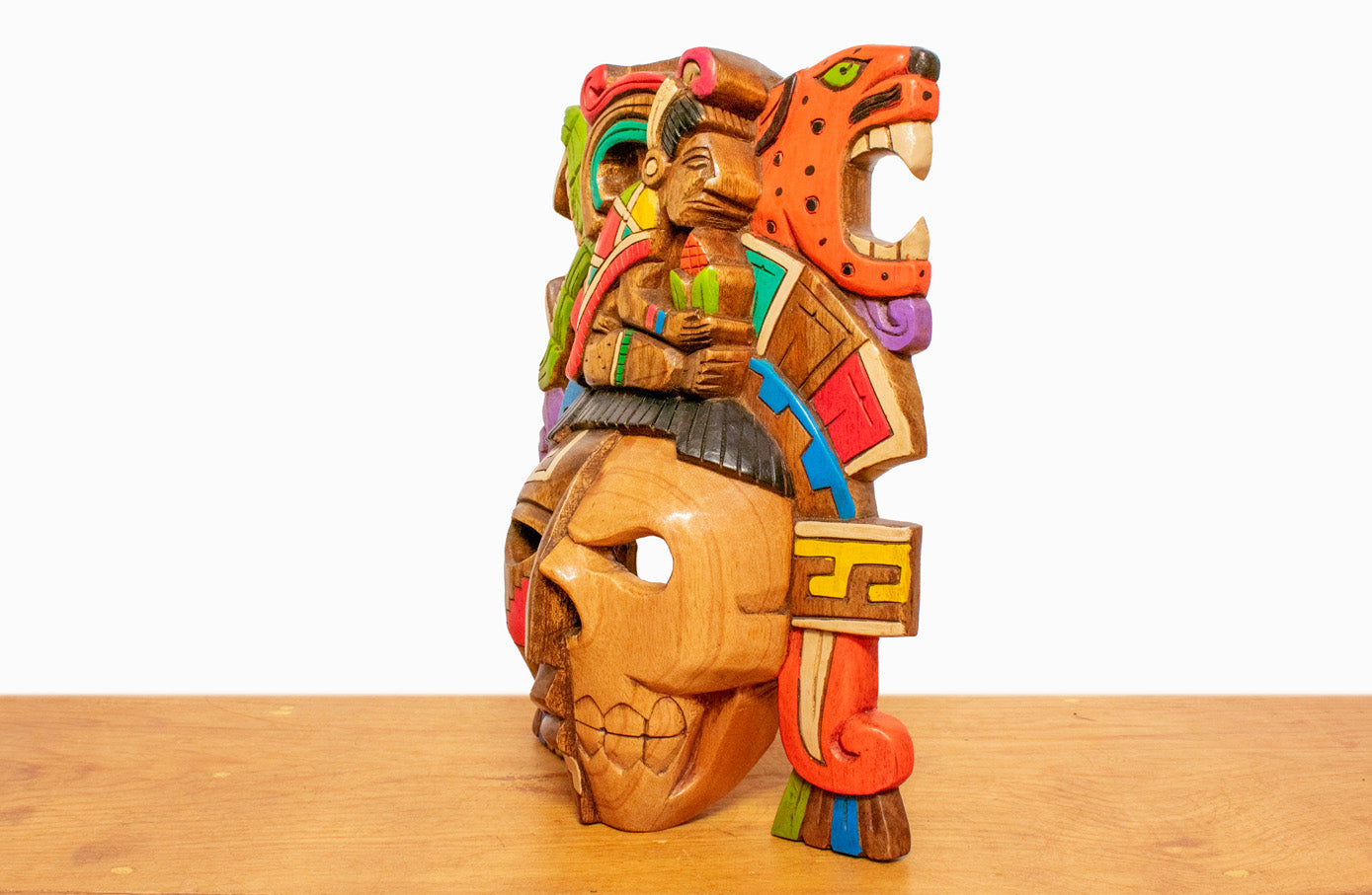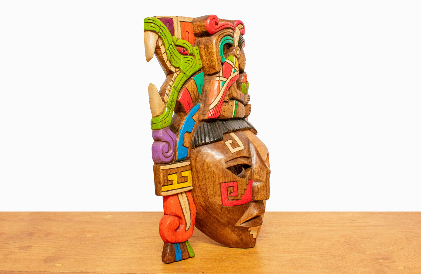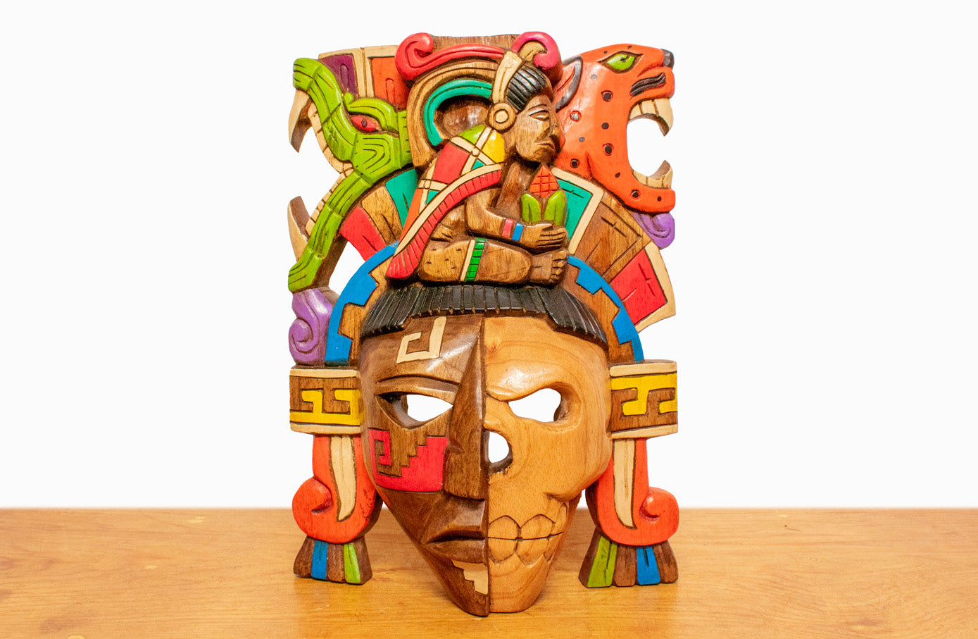 Colorida máscara de madera de cedro, representando a deidad del maíz. Tallada y pintada a mano por artesanos mexicanos en el estado de Yucatán.
