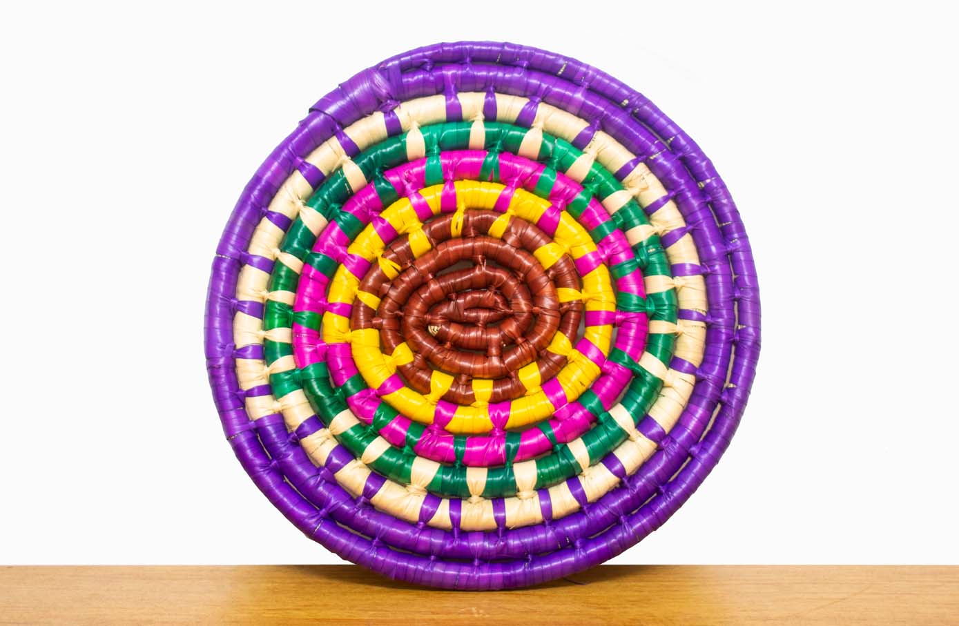 Colorido porta caliente tejido en palma de colores, hecho a mano por artesanos mexicanos en el Estado de México.