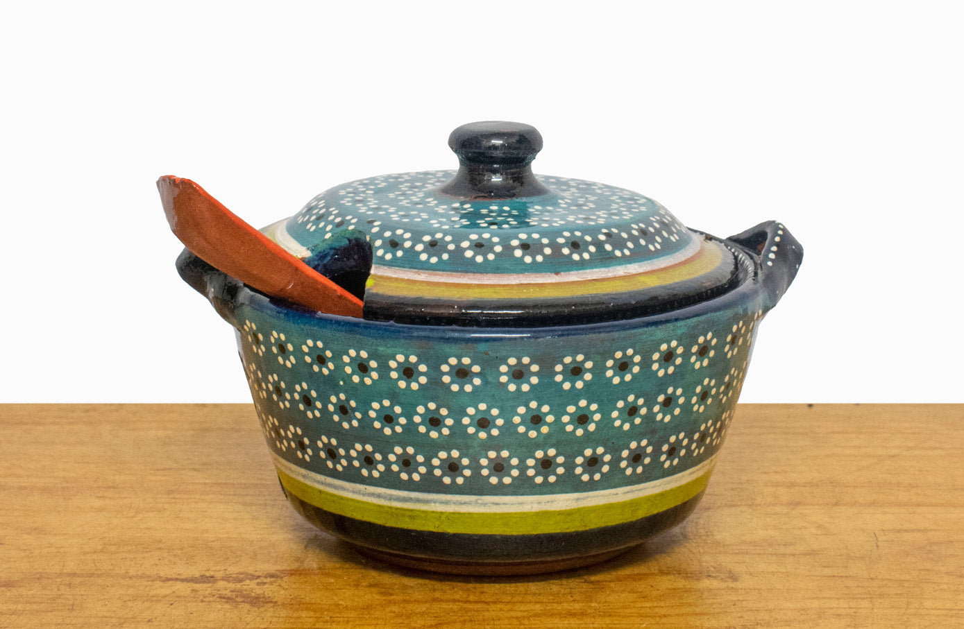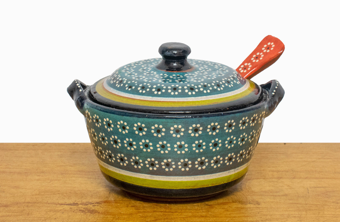 Tradicional salsera con tapa y cuchara, hecha con barro a mano por artesanos mexicanos en el estado de Michoacán.